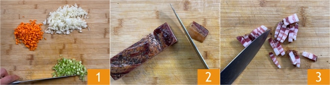 Para preparar la pasta y garbanzos, primero limpiad y picad finamente la zanahoria, la cebolla y el apio 1. Quitad la corteza de la panceta y reservadla 2, luego cortad el resto en tiras 3.