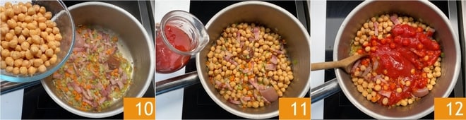 En este punto, añadid los garbanzos precocidos 10 y la salsa de tomate 11, mezclad 12 y dejad hervir a fuego lento durante unos 15 minutos.