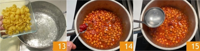 Mientras tanto, llevad a ebullición una olla con agua salada y coced la pasta corta muy al dente 13. Saboread la salsa con el concentrado de tomate 14 y alargadla con un cucharón del agua de cocción de la pasta 15.