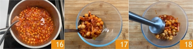 Ahora quitad la corteza 16 y transferid aproximadamente un tercio de los garbanzos a un vaso 17, luego triturad con una batidora de mano para reducirlos a crema 18.