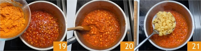 Verted la crema de garbanzos nuevamente en la cacerola 19 y mezclad todo 20. Escurrid la pasta en el condimento 21.