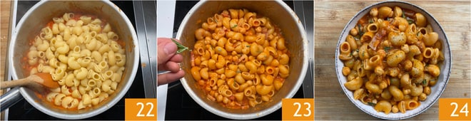Terminad la cocción de la pasta en la cacerola 22, añadiendo más agua hirviendo si es necesario. Aromatizad con algunas agujas de romero 23, añadid una pizca de pimienta y servid enseguida vuestra pasta y garbanzos 24.