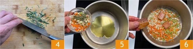 Por último, picad el romero 4. Calentad un poco de aceite en una cacerola, verted las verduras 5 y dejad que se sofrían durante unos minutos, luego añadid la corteza 6.