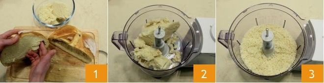 Para preparar la pasta y migas, cortad a la mitad una hogaza de pan y obtén la miga 1 para ponerla en la picadora 2 y triturarla finamente 3.