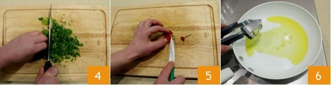 Preparad también los otros ingredientes: picad el ramillete de perejil 4 y desmenuzad la guindilla fresca, privándola de las semillas internas 5. Luego comenzad a tostar las migas del pan: en una sartén amplia calentad a fuego bajo 50 ml de aceite de oliva y aplastad medio diente de ajo 6