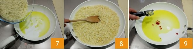 Cuando el ajo esté dorado, añadid las migas 7 y mezclad con una espátula de madera para dar sabor 8 y evitar que se quemen: deberán tostarse a fuego medio durante unos 5-8 minutos. Mientras tanto, en otra sartén amplia, calentad los 50 ml de aceite de oliva restantes, añadid la guindilla picada y la otra mitad del diente de ajo pelado 9.