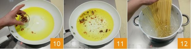 Escurrid los filetes de anchoa del aceite de conservación y vertedlos en la sartén 10, luego derretidlos a fuego medio 11. Llevad a ebullición abundante agua con sal y coced los espaguetis al dente 12.