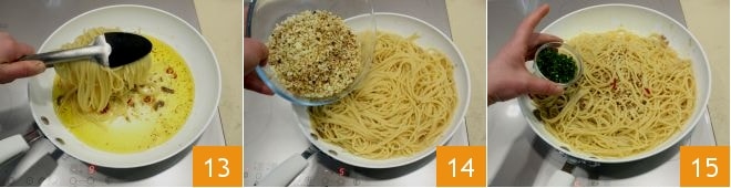 Cuando estén listos, escurrid los espaguetis (reservad el agua de cocción) y pasadlos a la sartén con ajo, aceite, guindilla y filetes de anchoa 13. Saltead la pasta a fuego alto, añadid las migas tostadas 14 y el perejil picado 15.