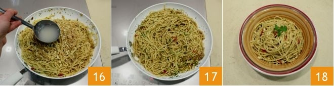 Mezclad y añadid un cazo de agua de cocción de los espaguetis 16. La pasta y migas está lista para ser servida bien caliente (17-18)!