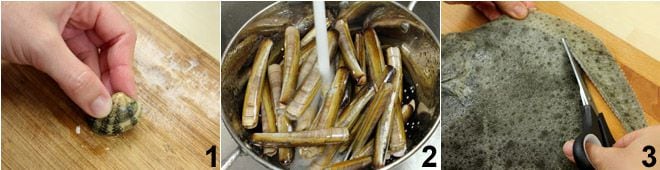 Para preparar la pasta y pescado en guiso, comience limpiando todo el pescado: limpie muy bien bajo el agua fría los mejillones eliminando aquellos rotos o abiertos, luego quíteles la barba que sobresale de las valvas y raspe la concha con un cuchillo o con una esponja nueva de acero (Cómo limpiar y abrir los mejillones) en cuanto a las almejas finas, aquí hay un truco para eliminar las llenas de arena: ármese de paciencia y tómelas una por una, golpee la almeja con la parte de corte sobre una tabla de madera 1 y verifique si sale negro. Si esto sucede, deseche la almeja porque estará llena de arena muy oscura. Enjuague las galeras bajo el agua fría y las navajas 2.