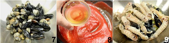 En una sartén grande prepare un sofrito con un diente de ajo machacado y aceite de oliva virgen extra, coloque los mejillones y las almejas 7, cubra con una tapa y deje que se abran. Mientras tanto, en un cazo, haga disolver el concentrado de tomate con un poco de agua y agregue el vinagre de vino blanco 8. Añada las galeras enteras a los mejillones y a las almejas ya abiertas 9,