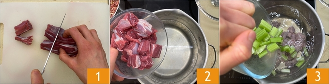 Para preparar la pasta en caldo de carne, primero corta la carne en trozos 1 y haz lo mismo con las verduras. Vierte la carne en una olla grande con abundante agua fría 2, luego añade el apio 3.