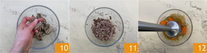 Cuando la carne esté blanda y bien cocida, escúrrela y déjala enfriar, reservando el caldo y las verduras. Una vez que se haya enfriado, desmecha la carne con las manos o desmenuza groseramente 10 11. Mientras tanto, tritura las verduras cocidas con una batidora de mano 12.