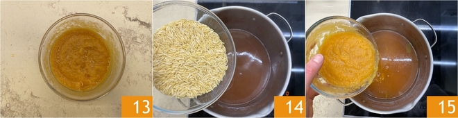 Debes obtener una crema suave y aterciopelada 13. Si el caldo es muy abundante, puedes eliminar una parte, luego vierte la pasta directamente en la olla después de llevarlo a ebullición 14 y cocina durante el tiempo indicado en el paquete. Hacia el final de la cocción, agrega la crema de verduras 15.
