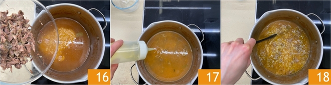 Añade también la carne desmechada 16 y mezcla todo. Con el fuego apagado, completa con un hilo de aceite 17 y mezcla bien 18, ajustando la consistencia con más caldo al gusto.