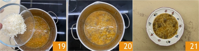 Por último, añade el Parmigiano Reggiano rallado 19 y mezcla una última vez 20. ¡Sirve inmediatamente tu pasta en caldo de carne 21!