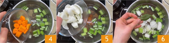 Añade también la zanahoria 4, la cebolla 5 y aromatiza con una hoja de laurel 6.