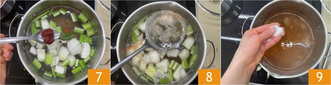 Completa con el concentrado de tomate 7, que dará al caldo un color cálido y un sabor más redondeado. Lleva a ebullición y cocina desde ese momento durante aproximadamente 2 horas, o hasta que la carne esté tierna. Durante la cocción, elimina con una espumadera la espuma que se forma en la superficie 8: es un paso importante para obtener un caldo más claro, delicado y fácil de digerir. Solo en la última media hora ajusta la sal 9, así el sabor quedará equilibrado y no correrás el riesgo de obtener una sopa demasiado salada.