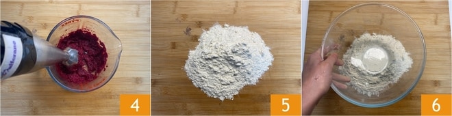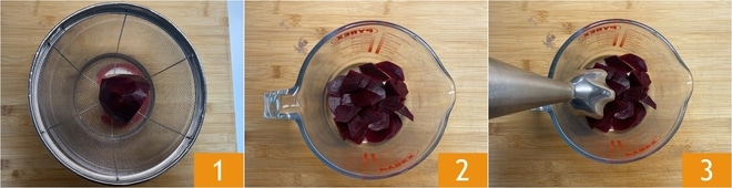 Para preparar la pasta fresca de remolacha, escurre la remolacha precocida para eliminar cualquier líquido 1. Córtala en pedazos y colócala en un vaso 2, tritura finamente con la batidora de mano 3.