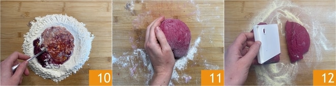 Utiliza un tenedor para comenzar a mezclar los ingredientes inicialmente sin tomar más harina 10, luego comienza a incorporar cada vez más harina y cuando la masa esté lo suficientemente seca, continúa a mano y trabaja hasta que quede lisa y homogénea, teniendo cuidado de no romperla, para no dañar la red de gluten. Si es necesario, añade más harina según se requiera. Una vez obtenida una bola 11, cúbrela y déjala reposar al menos 30 minutos. Con la espátula, corta la mitad de la masa 12. (Puedes mantener la otra mitad cubierta con film para que no se seque).