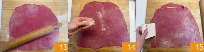 Puedes extender con el rodillo o con la máquina de pasta para realizar los formatos que prefieras. Nosotros hemos preparado tagliatelle, extendiendo con el rodillo sobre una superficie espolvoreada con sémola (o ligeramente enharinada). Estira la masa lo más fina posible 13, si utilizas la máquina de pasta, llega al penúltimo grosor, espolvorea con sémola 14 y deja secar por unos minutos. Empareja los bordes para crear un rectángulo 15.