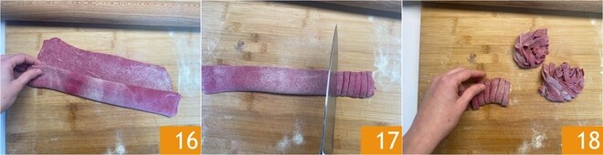Enrolla la masa 16, corta rodillos de aproximadamente 7 mm 17 y forma los clásicos nidos 18.