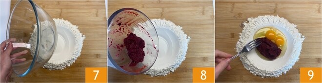 Una vez creado el espacio 7, vierte dentro el puré de remolacha 8 y los dos huevos 9.