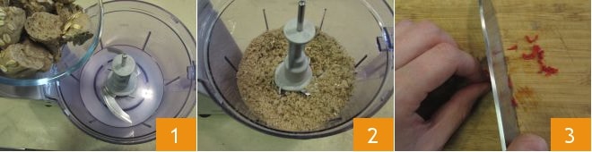 Para preparar la pasta fría con berenjenas y feta, primero pon a hervir una olla de agua con sal que usarás para cocinar la pasta, luego toma el pan integral duro cortado en rebanadas, colócalo en una batidora con cuchillas de acero 1 y tritura hasta obtener migas gruesas 2. Lava los chiles, retírales las semillas y pícalos finamente 3.