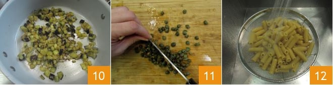 Cocina a fuego medio-alto durante 4-5 minutos, hasta que estén bien dorados 10, luego retira el ajo de la sartén, sala y pimienta. Mientras tanto, enjuaga las alcaparras bajo el agua corriente para eliminar la sal y pícalas con un cuchillo 11. Cuando la pasta esté al dente, escúrrela, pásala rápidamente bajo un chorro de agua 12