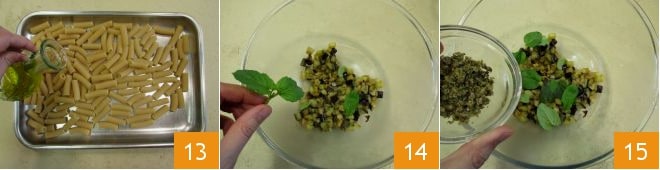 y déjala enfriar en una bandeja grande después de haberla condimentado con el aceite 13. Ahora toma un cuenco grande y mezcla todos los ingredientes: los cubos de berenjenas doradas, las hojas de menta que habrás lavado y secado previamente 14, las alcaparras picadas 15,