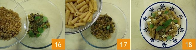 las migas de pan tostadas 16, los tortiglioni integrales 17 y finalmente el feta desmenuzado 20. Mezcla bien y divide la pasta así condimentada en los platos para servir, adornando al final con algunas migas más de feta y de pan 18: ¡tu pasta fría con berenjenas y feta está lista para ser disfrutada!