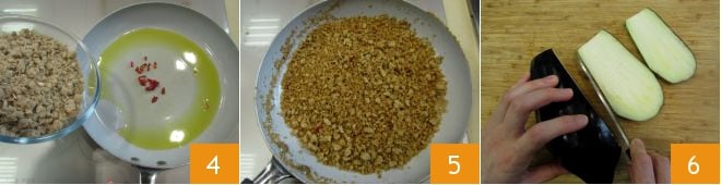 Vierte la mitad del aceite en una sartén, añade el chile picado y las migas de pan 4 y déjalas dorar a fuego medio-alto durante unos minutos, teniendo cuidado de no quemarlas 5. Ahora lava las berenjenas y elimina los extremos; corta las berenjenas primero en rodajas 6,