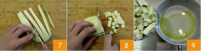luego en tiras de aproximadamente 1 cm de ancho 7 y finalmente en cubos 8. Cocina la pasta en abundante agua con sal a tu gusto. Aparte, calienta la otra mitad del aceite en una sartén, añade un diente de ajo y los cubos de berenjenas 9.
