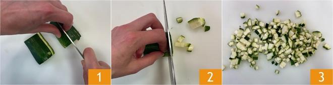 Para preparar la pasta fría con atún y calabacines, primero corte los extremos de los calabacines y córtelos en cubos 1 2 3.