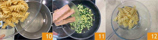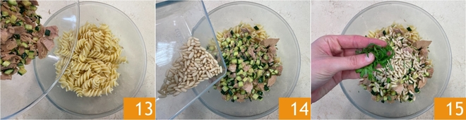 Cocine los fusilloni en la misma agua de cocción de los calabacines 10. Mientras tanto, añada el atún escurrido a los calabacines 11 y desmenúcelo con la cuchara, luego vierta un poco del agua de cocción de la pasta y mezcle para combinar y sazonar. Apague el fuego y deje enfriar el condimento. Escurra la pasta en un bol 12 y deje enfriar también.