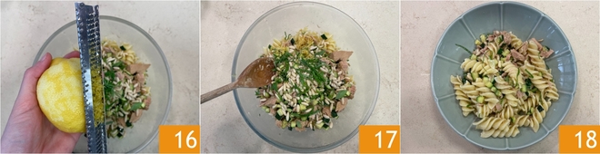 Finalmente, aromatice con la ralladura de limón 16. Mezcle bien todo 17 y sirva su pasta fría con atún y calabacines, adornando al gusto con más ralladura de limón 18!