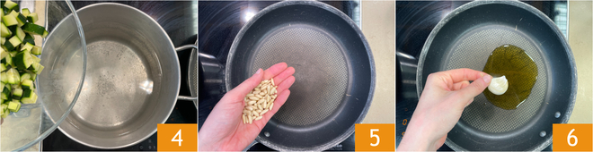 Escalde los calabacines en agua hirviendo con sal 4 durante 2 minutos. Mientras tanto, tueste los piñones en una sartén antiadherente 5. En otra sartén, añada el aceite con el diente de ajo 6.