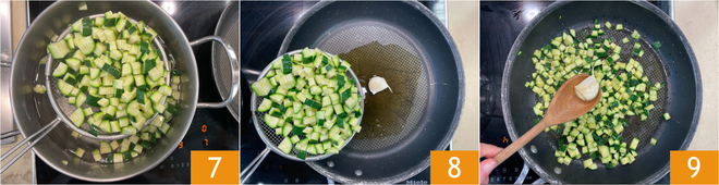 Escurra los calabacines 7 y transfiéralos a la sartén con el aceite y el ajo 8, luego saltéelos a fuego medio durante 15 minutos 9.