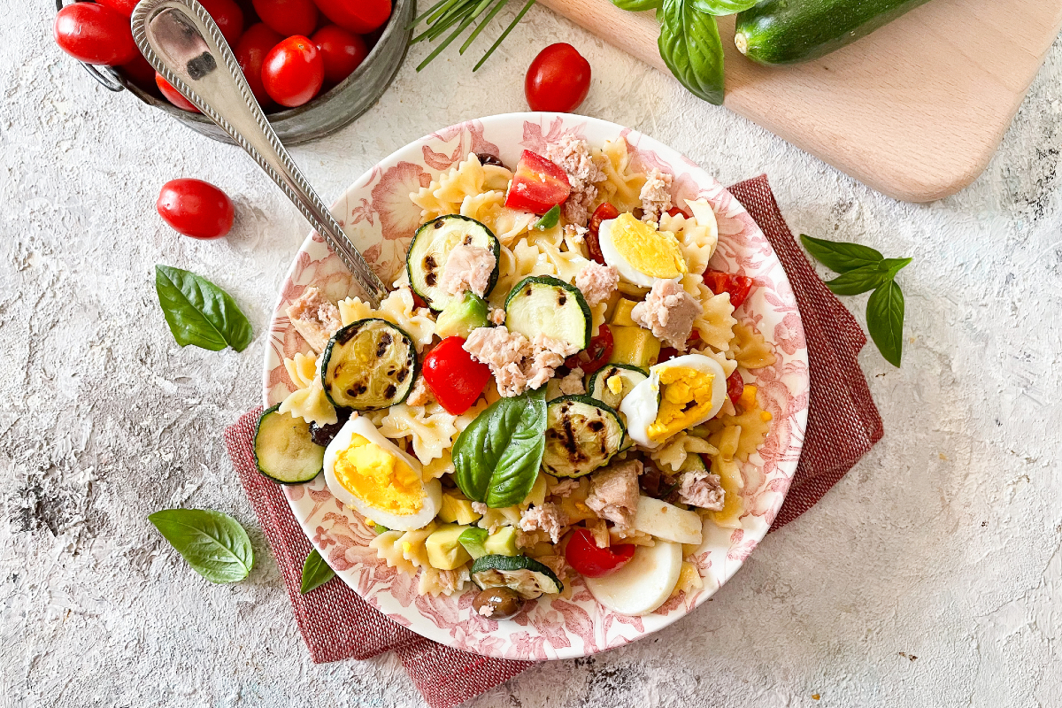 La Pasta fría es uno de los platos veraniegos que más nos encantan. Hay tantas variantes de pasta fría, todas exquisitas y originales, hoy os presentamos una versión sencilla pero sabrosa: la pasta fría con atún. Un primer plato fácil de preparar, que se puede personalizar con los ingredientes que se tienen en casa y cómodo de llevar de excursión o al trabajo. Para realizar esta pasta, además del atún, hemos añadido calabacines a la parrilla, tiernos cubitos de aguacate, tomatitos, aceitunas, huevos cocidos y muchas hierbas aromáticas que le darán un delicioso aroma. Por supuesto, podréis variar todos estos ingredientes según vuestros gustos, creando un plato siempre diferente para compartir con toda la familia!