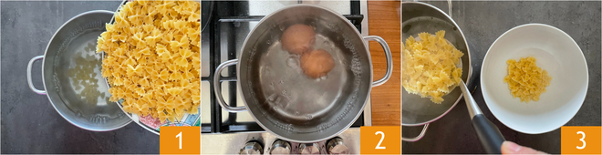 Para preparar la pasta fría con atún como primer paso coced las mariposas en agua hirviendo con sal 1. Mientras tanto, poned a cocer los huevos en un cazo, empezando con agua fría, y cocedlos durante 7 minutos desde que el agua empiece a hervir 2. Tan pronto como la pasta esté al dente, pasadla a un bol grande 3.