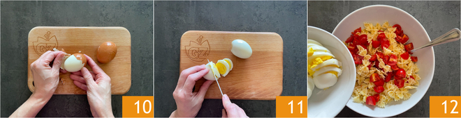 Recoged ahora los huevos y peladlos 10. Cortadlos en rodajas 11, o si preferís en gajos. Cuando la pasta esté fría, añadid los tomatitos en trozos y los huevos cocidos 11.