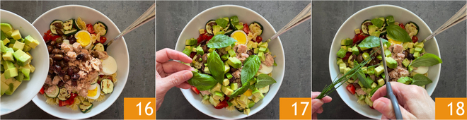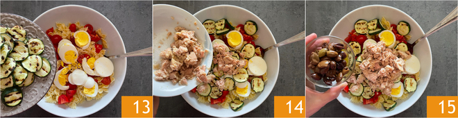 Agregad también los calabacines asados 13, el atún bien escurrido 14 y las aceitunas 15.