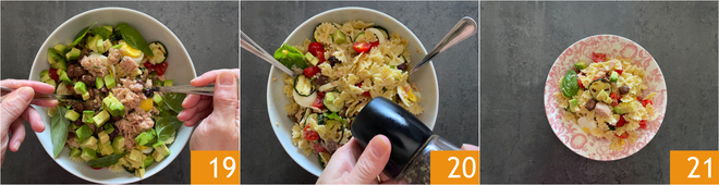 Mezclad bien 19, sazonad con sal y pimienta 20. Añadid un buen chorro de aceite y mezclad de nuevo. Guardad la pasta fría con atún en la nevera hasta el momento de servirla 21.