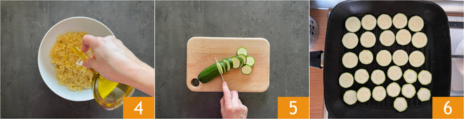 Condimentadla con un chorrito de aceite 4, mezclad y dejad que se enfríe. Pasados los 7 minutos, escurrid también los huevos y enfriadlos bajo agua corriente. Pasad a los calabacines: lavadlos bien y cortadlos en rodajas 5. Calentad una parrilla y colocad encima las rodajas de calabacín 6.