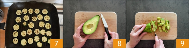 Cocedlas a fuego medio durante 3-4 minutos, cuando estén bien asadas, podréis darles la vuelta 7. Terminad de cocerlas también por el otro lado, luego reservadlas en un plato. Pasad al aguacate, divididlo a la mitad y eliminad el hueso central 8. Peladlo y cortadlo en trozos 9, en total necesitaréis unos 120 g. Lavaz los tomatitos y cortadlos en 4 partes.