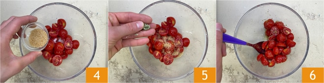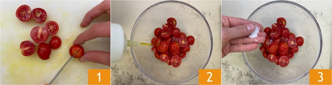 Para preparar la pasta fría con pesto de rúcula y tomates cherry, lo primero es cortar los tomates cherry por la mitad 1 y pasarlos a un bol. Condimentar con aceite 2 y sal 3.