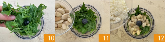 Mientras se cuece la pasta, se puede preparar el pesto: en un procesador juntar la rúcula 10, las almendras 11 y el queso pecorino 12.
