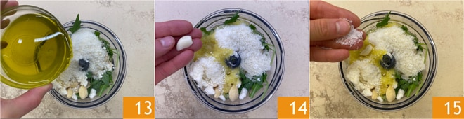 Añadir también el aceite 13, el ajo 14 y la sal 15. Triturar hasta obtener una mezcla homogénea.