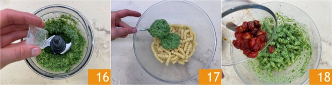 Si se desea, se puede añadir un cubito de hielo para mantener un color brillante 16. Escurrir la pasta al dente y condimentar con el pesto de rúcula 17, luego añadir los tomates cherry 18, reservando algunos para el emplatado. Mezclar bien y emplatar.