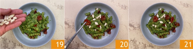 Completar con almendras tostadas troceadas groseramente 19 y los tomates cherry confit restantes 20. ¡Tu pasta fría con pesto de rúcula y tomates cherry está lista para ser degustada 21!